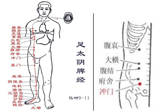 【名称释义】 冲,冲射、冲突也。门,出入的门户也。该穴名意指脾经下部诸穴传来的经气由本穴上冲腹部。本穴物质为脾经腿膝下部经气汇聚而成,在本穴的运行为受热后的上冲之状,故名。 【定位】 在腹股沟区,腹股沟斜纹中,髂外动脉搏动处的外侧。 【取穴】 在腹股沟外侧,距耻骨联合上缘中点3.5寸,当髂外动脉搏动处的外侧。 【特定穴】 无。 【主治病症】 1. 腹痛,疝气;2. 崩漏,带下,胎气上冲等妇科病证。 【经验应用】 现代常用于治疗疝气、尿潴留、睾丸炎、子宫内膜炎等。配气冲治疗带下;配天枢、太冲等主治疝气。 【针灸取穴】 避开动脉,直刺 0.5 ~ 1 寸。 (供稿:五指山市中西医结合医院中医科)